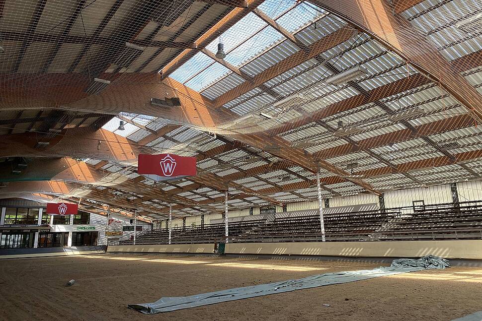 Die größere Reithalle (Maße: 25 x 70m) dient als unsere Auktions- und Veranstaltungshalle, in der mehrmals im Jahr eigene und externe Veranstaltungen stattfinden. Im Alltag des Pferdezentrums wird sie für die tägliche Arbeit genutzt. Auch diese Halle wurde kürzlich saniert und ist durch ein neues Dach mit Lichtfirst hell und einladend. Neben den Tribünen, die den Reitbereich umrahmen, gibt es ein Casino, das als Versammlungs- und Veranstaltungsort dient. Ein vor wenigen Jahren eingebauter Boden mit Ebbe-Flut-System bietet optimale Verhältnisse sowohl für den Alltag als auch während Veranstaltungen.