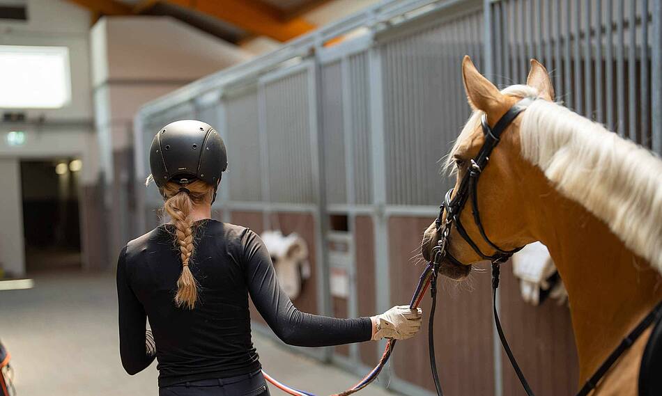 Innerhalb der Stallungen befinden sich zudem zahlreiche Wasch- und Putzplätze. Jeder von ihnen ist mit rutschfesten Gummimatten ausgestattet. Beidseitiges Anbinden sowie genügend Platz für Qualität und Sicherheit von Pferden, Pflegern und Reitern gehören zu unseren Standards. Jede Stallgasse verfügt außerdem über ein höhenverstellbares Solarium. Gerade in den kalten Wintermonaten genießen unsere Ausbildungs- und Auktionspferde den Solarium-Luxus nach getaner Arbeit.