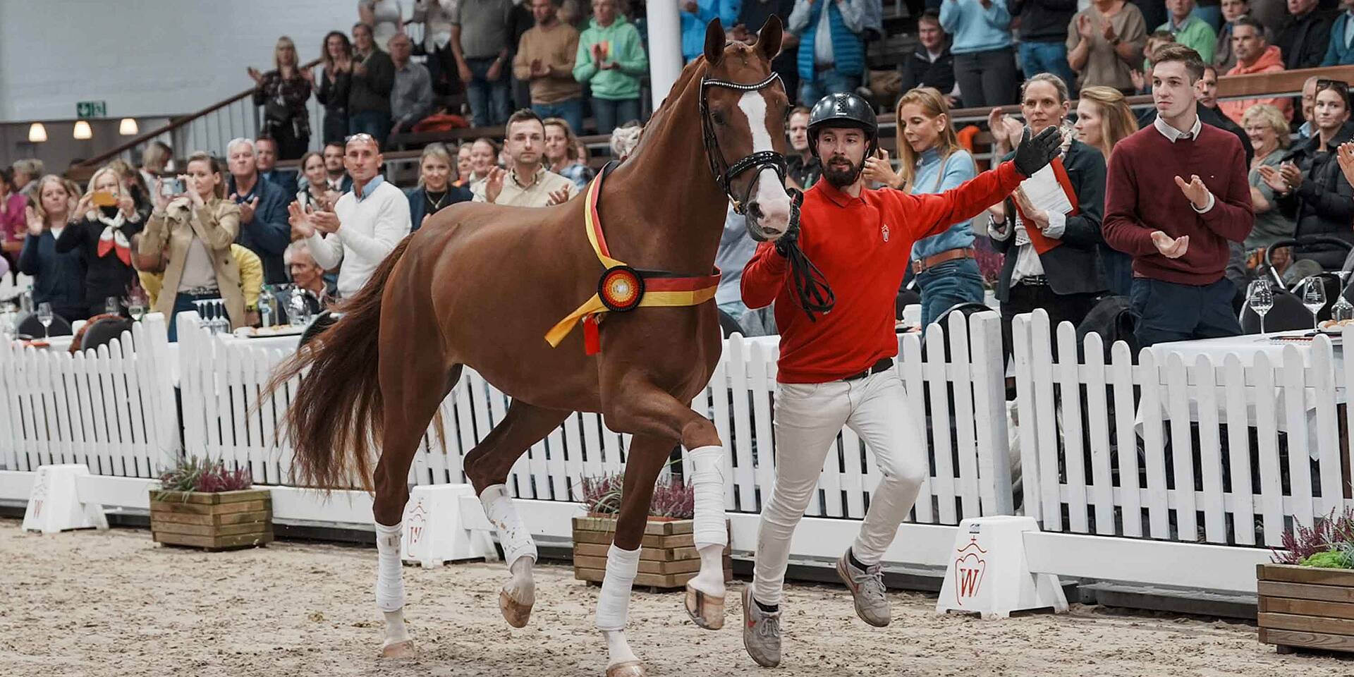 The OnLive auction got off to a brilliant start this afternoon. With the special head number 1001, a very special horse entered the Westphalian auction arena. Senorita la Bonita was crowned Bundeschampioness of three-year-old riding horses just a few weeks ago in Warendorf. On the final day there, the daughter of Sir Heinrich/Westernhagen received the ideal score of 10.0 for both trot and canter. Breeder and exhibitor Axel Windeler says of his Bundeschampioness: ‘As a young horse, Senorita la Bonita has the best qualities a horse can have! I wish her the necessary time, the best training and a careful development. She is a horse that we will certainly see again at the major championships.’ Excitement was in the air as the beautiful mare, decorated with the Bundeschampionat sash, entered the packed auction hall. Bids flew in online and on the phones. At 420,000 euros, one bidder entered online and secured a clear lead with a big move to 500,000 euros. In the end, Senorita la Bonita was knocked down to customers on the phone for 550,000 euros. In honour of the champion as well as her new owner and breeder, the audience rose to their feet and celebrated this championship horse of the future in the Westphalian Auction Hall.