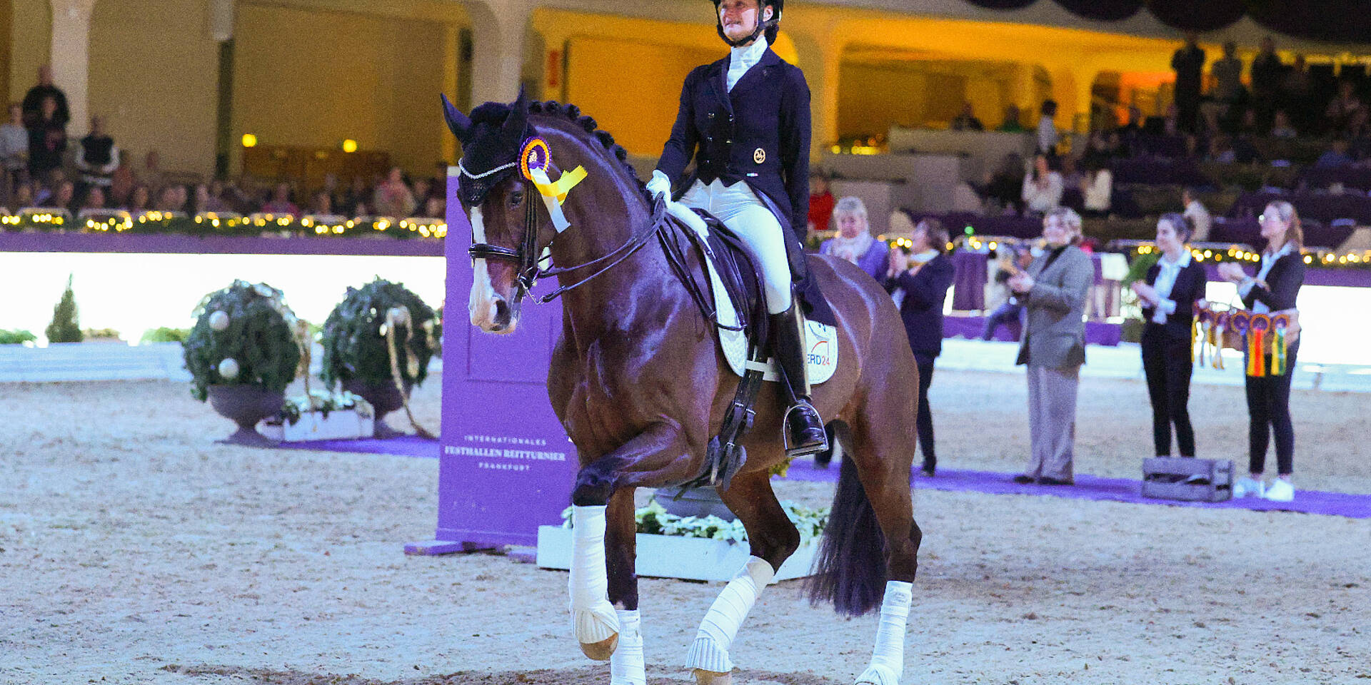 On the fourth weekend of Advent, the International Festival Hall Tournament took place in Frankfurt, as it does every year just before Christmas. The Louisdor Prize Final was once again one of the annual highlights for young dressage horses. In the final competition, a national young horse Grand Prix (FN) for 8-10-year-old horses, a Westphalian-registered mare took bronze. Shiva NRW by Sir Heinrich/Fürst Grandios, bred by August-Wilhelm Schmale, achieved the third best result with 69.72% under the saddle of her rider Nadine Plaster. We congratulate her on this great success!