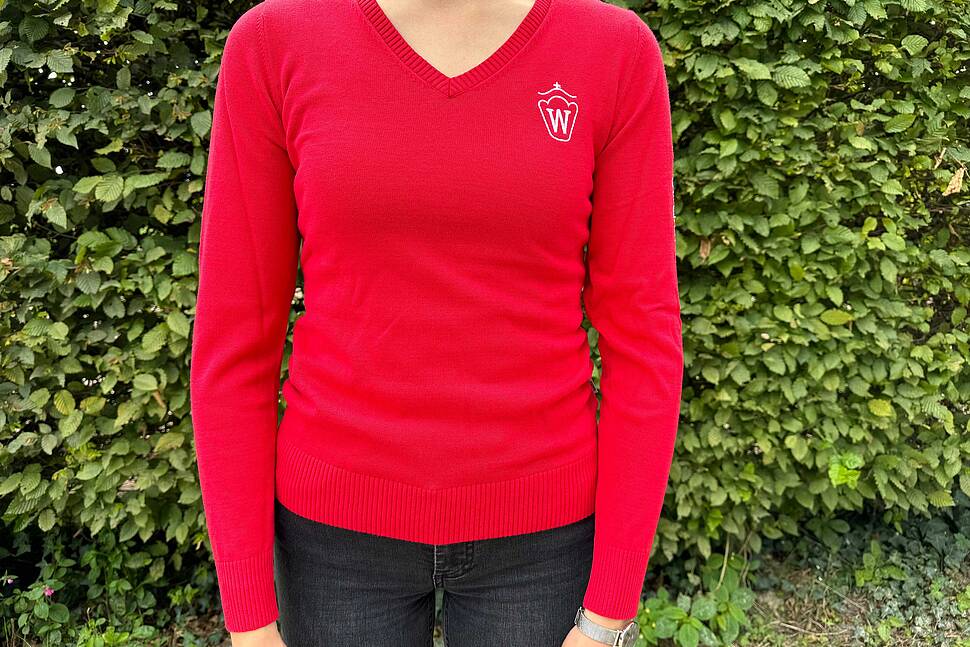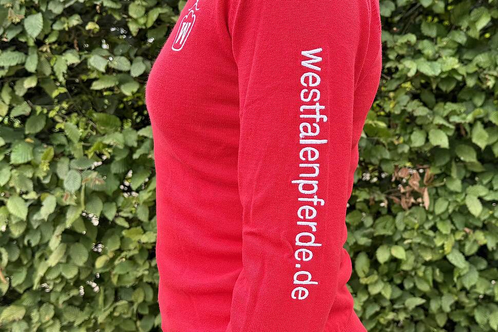 Feiner Strickpullover aus 100 % Baumwolle im Westfalenrot. Bestickung in weiß auf dem Ärmel und auf der Brust. V-Ausschnitt.