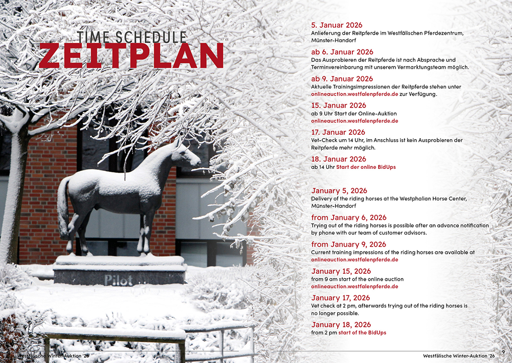 Zum Auftakt des neuen Jahres hat das Westfälische Pferdestammbuch ein breit gefächertes Auktionslost zu bieten. Vom gerade angerittenen Nachwuchspferd bis hin zum bereits hochplatzierten Nachwuchssportler, vom zukünftigen Turniercrack in Dressurviereck und Springparcours bis hin zum vielseitigen Partner im Freizeitsport, stehen in diesem Lot qualitätvolle Reitpferde zur Verfügung. Ergänzt wird das Lot von einer erlesenen Auswahl ungerittener Youngster aus dem Jahrgang 2023. Das Lot wird noch vor Weihnachten mit Fotos und Videos zur Verfügung stehen. Nur ein Klick zum Glück!
