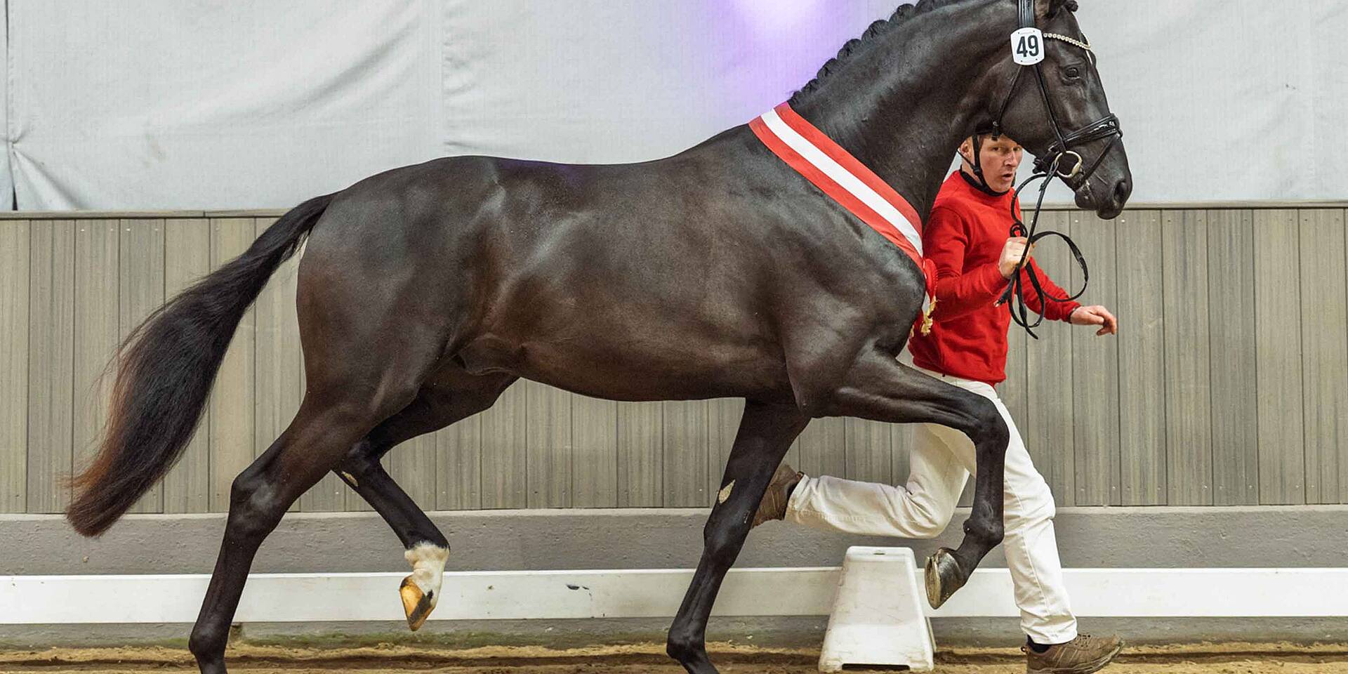 Ebenfalls die 100.000 Euro-Marke im Lot der springbetonten Hengste knackten die Kopfnummer 73 und 80, die beide als Prämienhengste ausgezeichnet wurden. Der bildschöne Sohn des Caressini/Come on (Z. u. Ausst.: Gestüt Gut Neuenhof KG, Nideggen) wechselte zum Zuschlagspreis von 120.000 Euro in den Besitz der Hengststation Maas J. Hell. Der Sohn des westfälischen Starvererbers Comme il faut NRW/Caretino (Z.: Helge Spallek, Ibbenbüren; Ausst.: Kurt Gravemeier, Münster) wechselte für 110.000 Euro den Besitzer. Für die 16 gekörten und verkauften springbetonten Hengste investierte die internationale Kundschaft durchschnittlich 73.400 Euro.